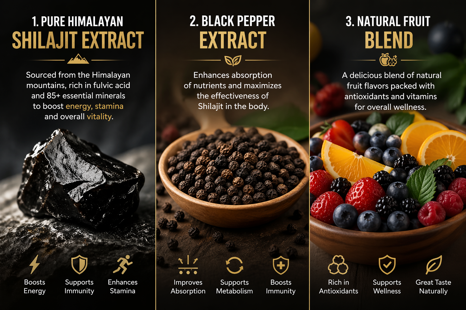 At the core is pure Himalayan Shilajit, known for its rich mineral content and fulvic acid, helping boost energy, improve stamina, and support mental clarity throughout the day.